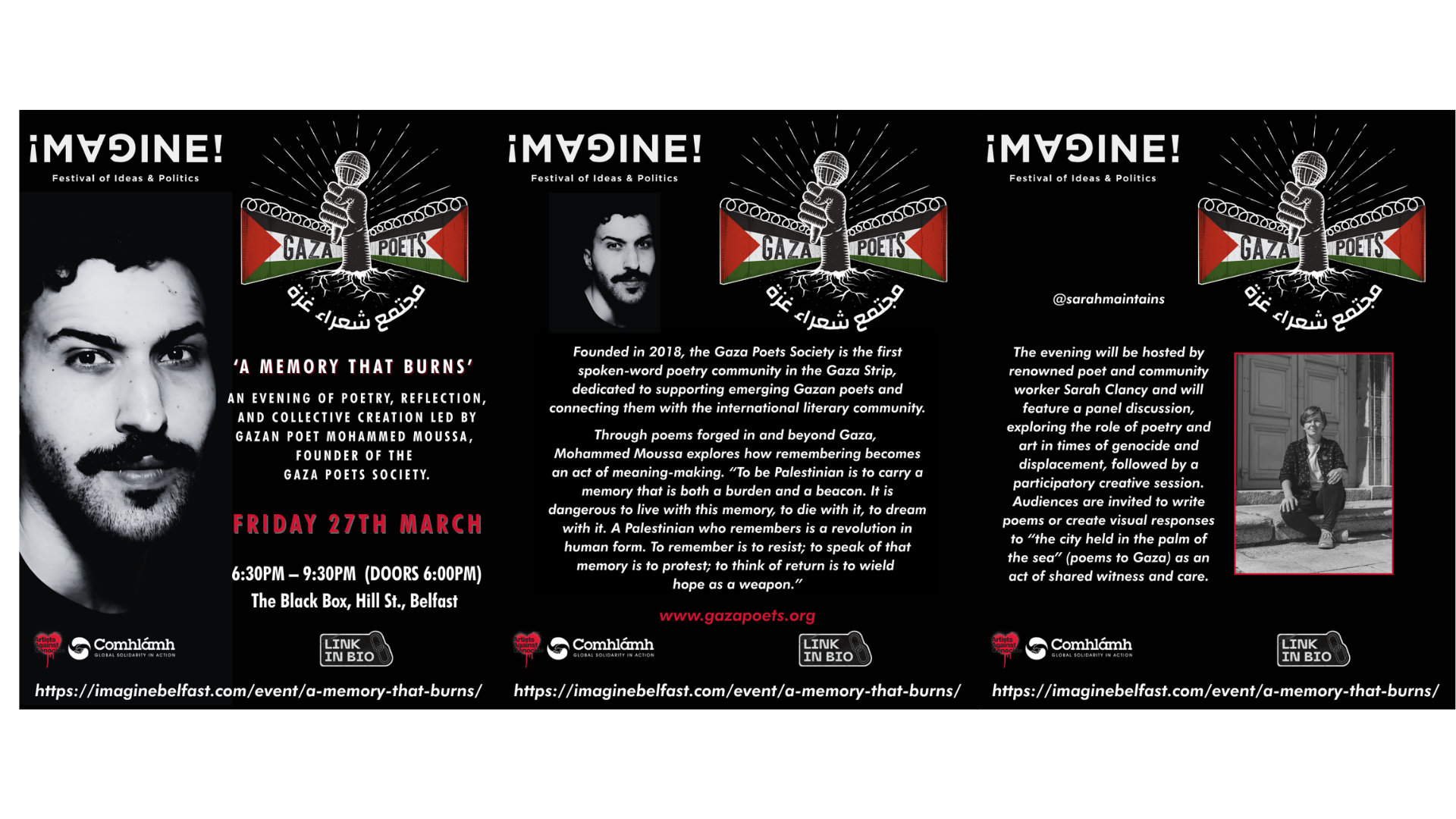 Organising this event with poet Mohammed Moussa founder of the Gaza Poets Society, the Artists Against Genocide and Comhlámh. Join us on the 27th of March as part of the Imagine Festival Belfast for “A Memory that Burns” led by Mohammed Moussa (Gaza Poets Society) and chaired by poet and community worker Sarah Clancy at the Black Box Belfast.